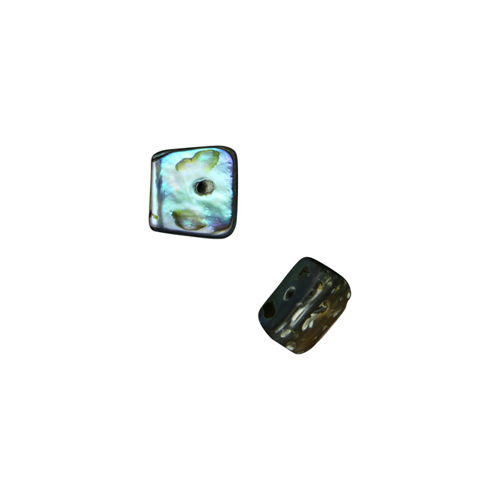 This bead is made from the rim of the Paua shell. Each bead is variable in size and thickness. The hole is drilled centrally through the flat side, which allows you to use it in a slightly different angle to other beads. Size: 10 x 8 x 3mm approximately. Quantity: per 48 beads.